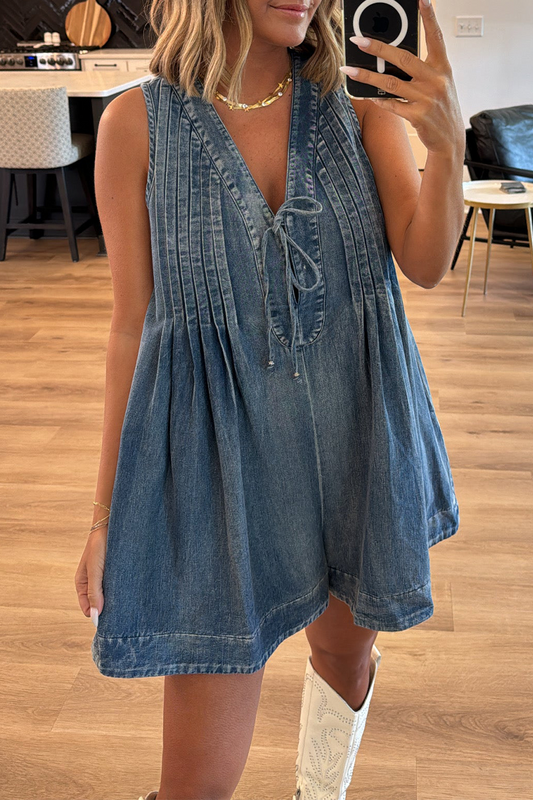 Casual Daily Solid Color Distressed Lace Up V Neck Sleeveless Loose Denim Jumpsuits