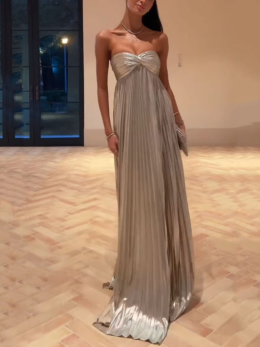 Metallic Pleated Off-The-Shoulder Maxi Dress