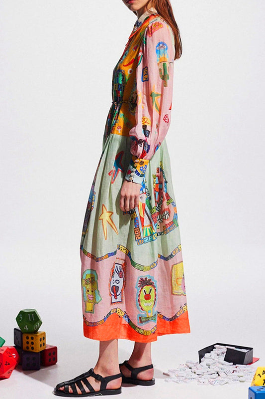 Elegant Graffiti Print Pocket Contrast Turndown Collar Printed Dresses