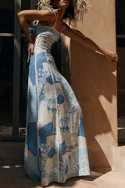 Casual Floral Print Patchwork Backless Square Neck Long Dresses