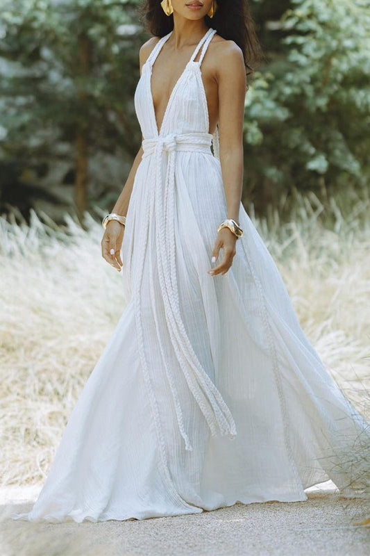 Sexy Solid Color Lace Up Backless Halter Beach Dresses
