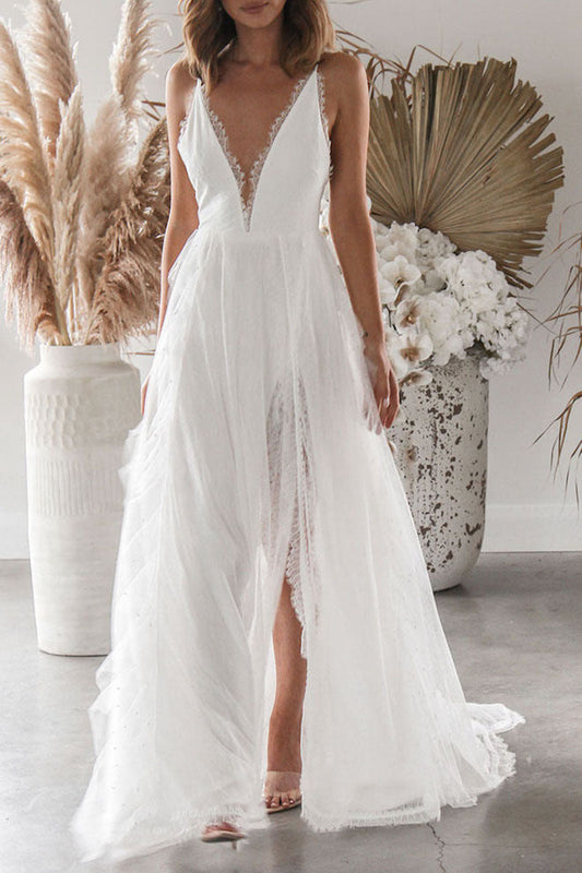 Elegant Tulle Butterfly Lace Applique Ball Slit Evening Maxi Dress