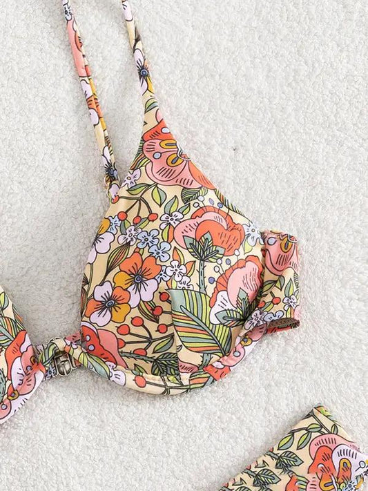 • Bohemian Floral Print Mid-Rise Tie-Down Bikini Set