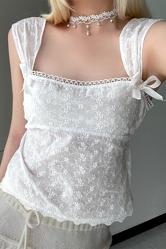 Sweet Solid Jacquard Bandage With Bow Square Collar Tops