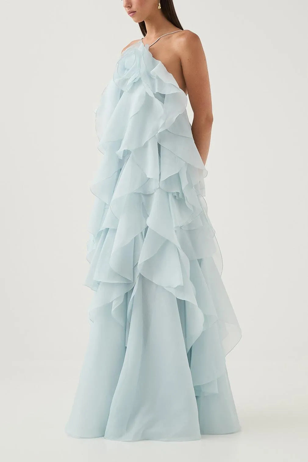 - Sleeveless, 3D flower, solid color, halter neck, frill, maxi dress