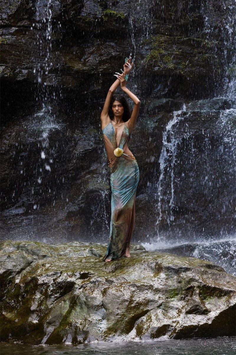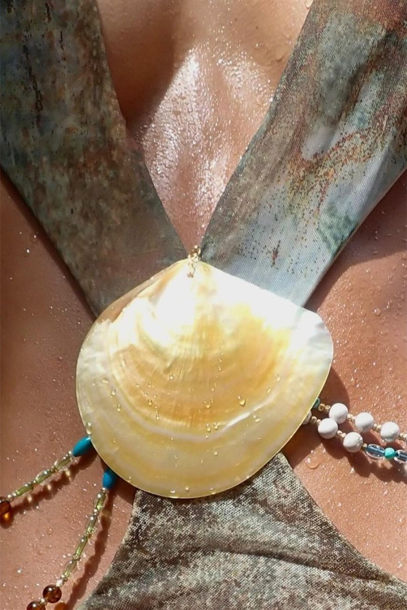 - Deep Plunge Neckline, Low Waisted, Removable Real Shell Trim, Removable Beaded Hip Chains, Halterneck, Maxi Length.