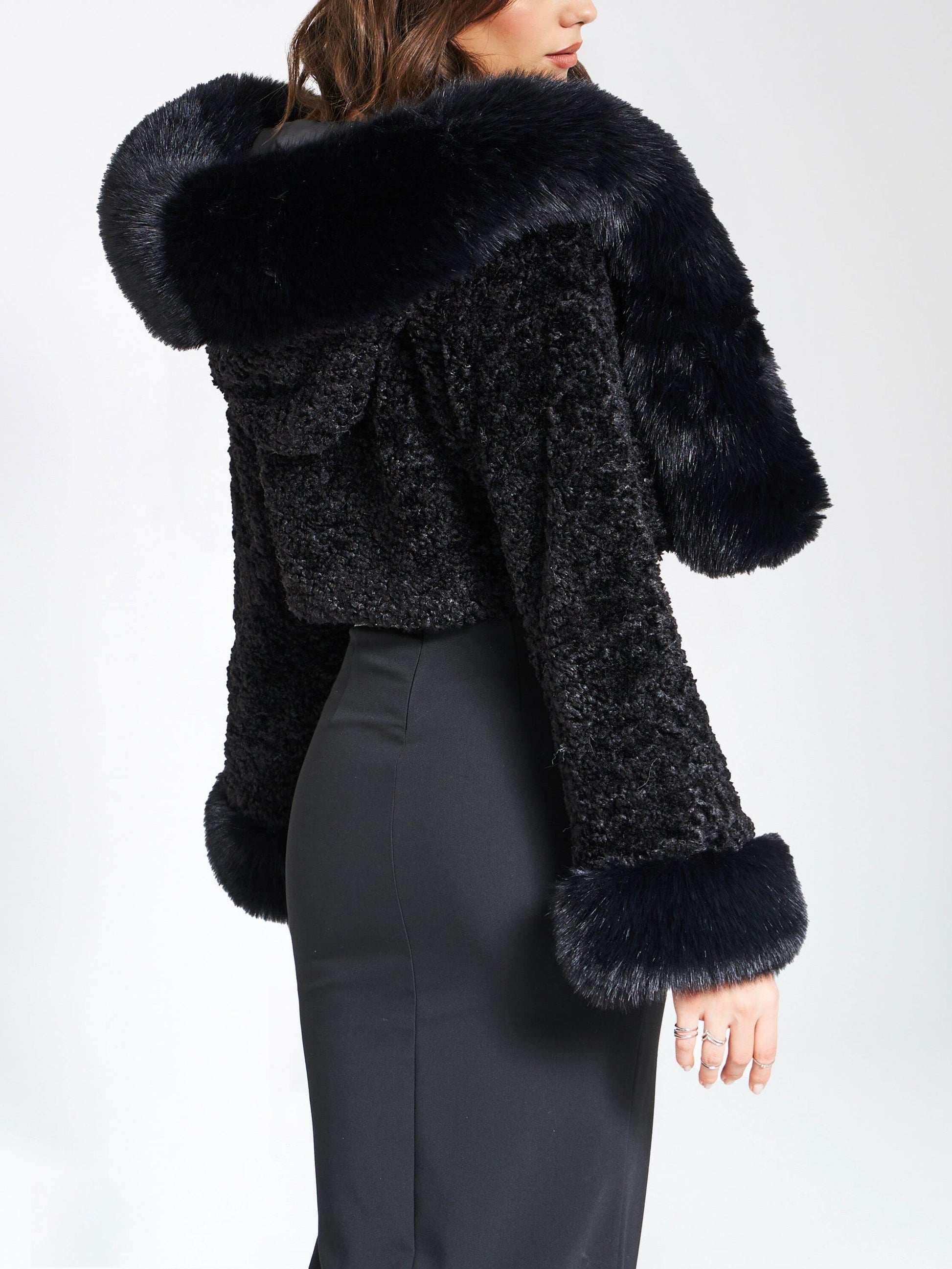 Faux Fur Hooded Cropped Coat With Rabbit Fur Collar