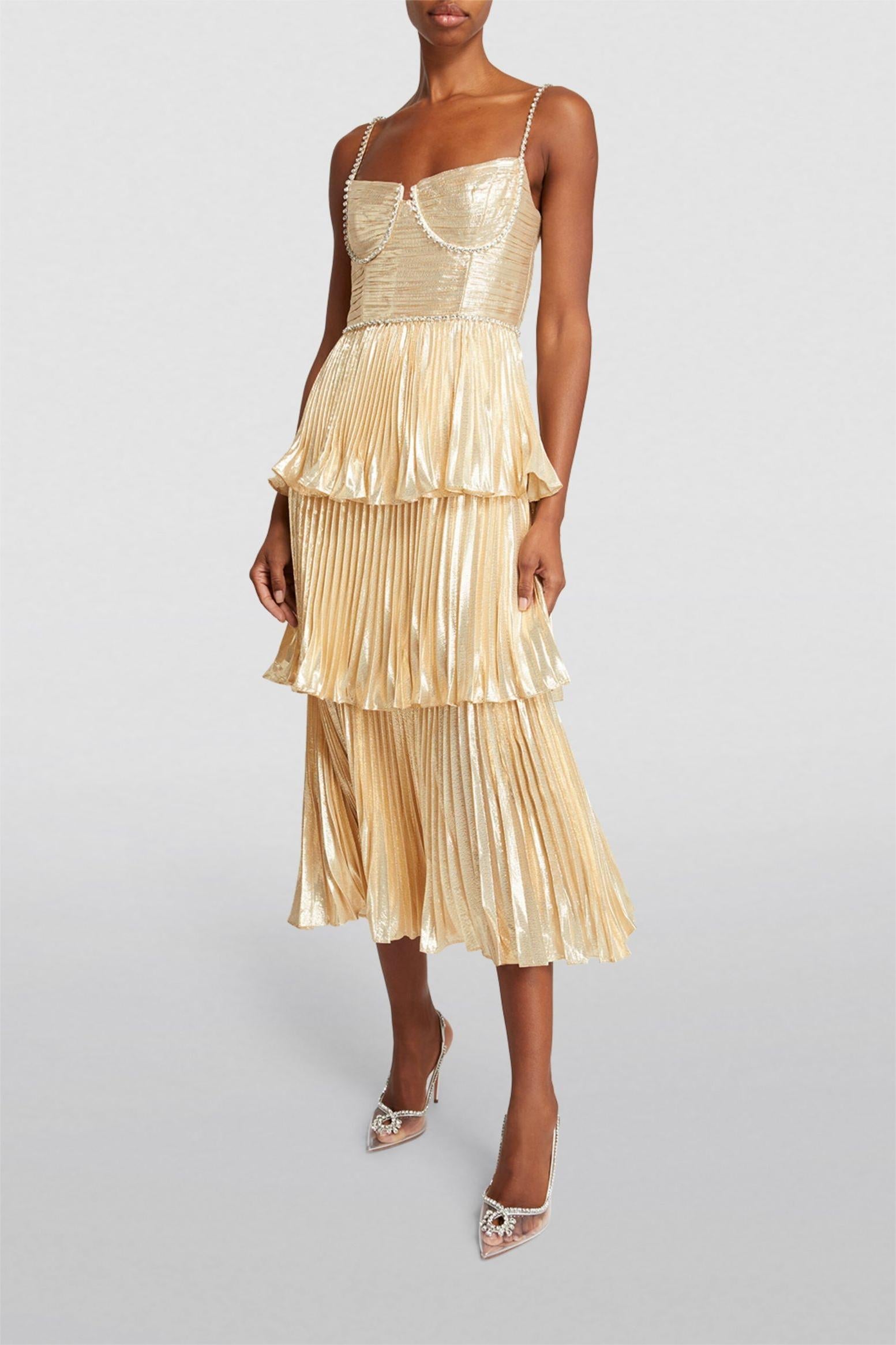 - Rhinestone, sleeveless, pleat, solid color, beige, midi dress