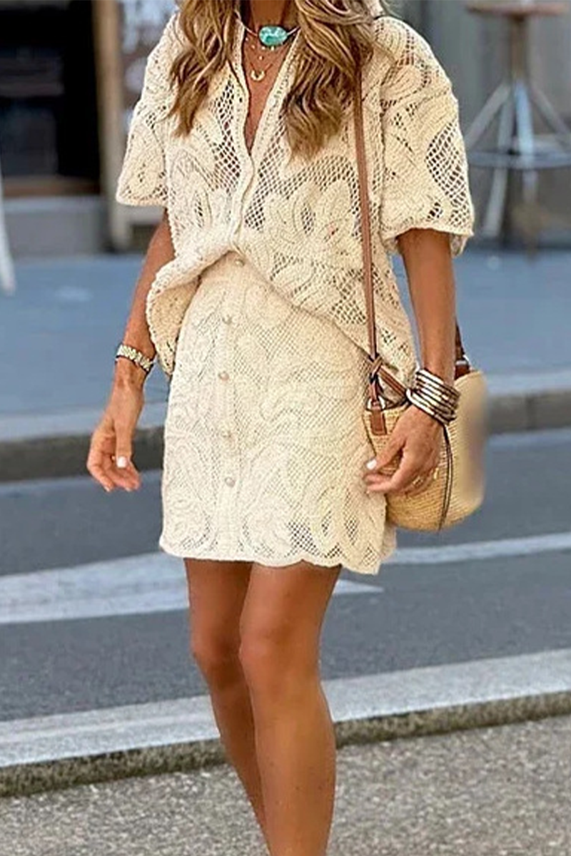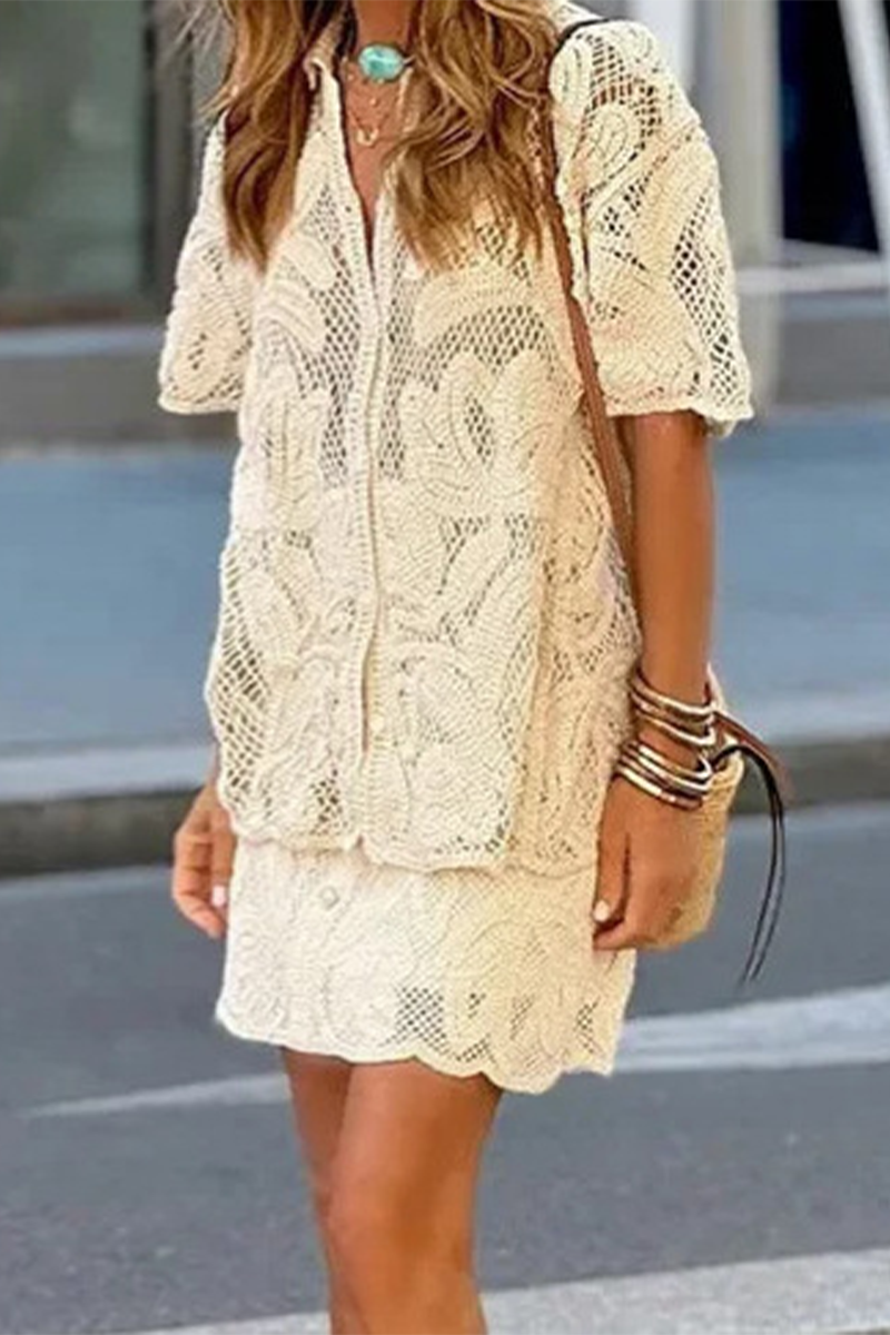 Street Elegant Hollow Out Buttons Turndown Collar Short Sleeve Two Pieces